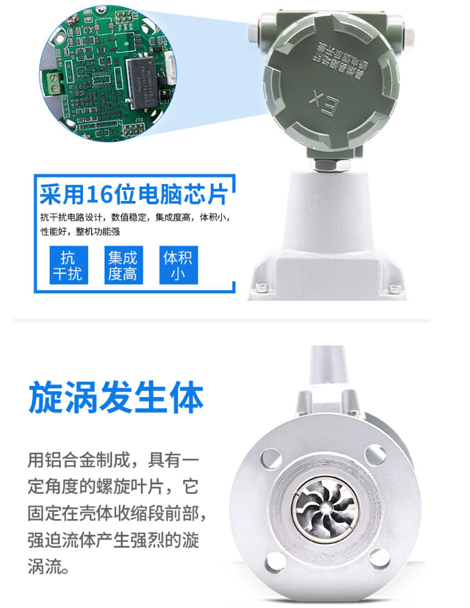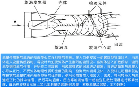 流量傳感器的流通剖面類似文丘里管的型線,在入口側(cè)安放一組螺旋型導(dǎo)流葉片,當(dāng)流體進(jìn)入流量傳感器時(shí),導(dǎo)流葉片迫使流體產(chǎn)生劇烈的旋渦流。當(dāng)流體進(jìn)入擴(kuò)散段時(shí),旋渦流受到回流的作用,開(kāi)始作二次旋轉(zhuǎn),形成陀螺式的渦流進(jìn)動(dòng)現(xiàn)象該進(jìn)動(dòng)頻率與流量大小成正比,不受流體物理性質(zhì)和密度的影響,檢測(cè)元件測(cè)得流體二次旋轉(zhuǎn)進(jìn)動(dòng)頻率就能在較寬的流量范圍內(nèi)獲得良好的線性度。信號(hào)經(jīng)前置放大器放大、濾波、整形轉(zhuǎn)換為與流速成正比的脈沖信號(hào),然后再 與溫度、壓力等檢測(cè)信號(hào)一起被送往微處理器進(jìn)行積算處理,在液晶顯示屏上顯示出測(cè)量結(jié)果(瞬時(shí)流量、累積流量及溫度、壓力數(shù)據(jù))。