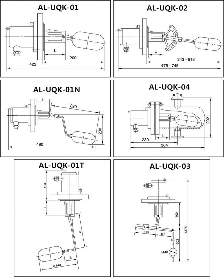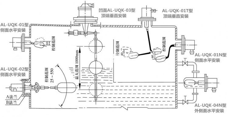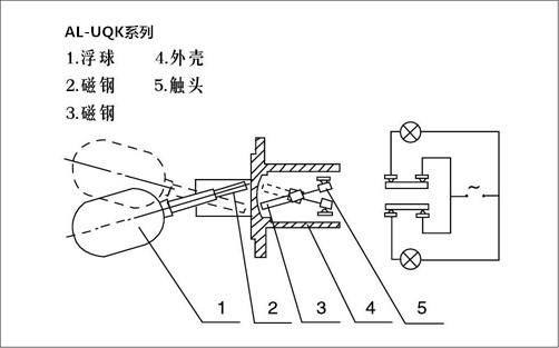 1、產(chǎn)品簡介UQK系列浮球液位控制器適用于工業(yè)生產(chǎn)過程中的各種敞口或受壓容器的液位控制。當(dāng)液位上升至高限時(shí)或下降至低限時(shí),控制器開關(guān)動(dòng)作并發(fā)出控制報(bào)警信號(hào)或控制泵、閥的開閉。UQK系列浮球液位控制器由浮球組件,行程開關(guān)組件及外殼組成。一對(duì)板性械斥的磁鋼分別安裝在浮球端部和行程開關(guān)組件上。當(dāng)浮球在動(dòng)作界限內(nèi)隨液位變化而上下升降時(shí),其端部的磁鋼也隨之上下擺動(dòng),通過非導(dǎo)磁的外殼推動(dòng)行程開關(guān)組件上磁鋼運(yùn)動(dòng),從而使輸出的觸點(diǎn)相應(yīng)接通或斷開,控制后級(jí)信號(hào)裝置發(fā)出光或聲的信號(hào)。當(dāng)浮球隨液位升降時(shí),只有其處于動(dòng)作界限上、下兩個(gè)板限位置時(shí),輸出觸點(diǎn)才會(huì)接通或斷開,而在升降過程中無任何信號(hào)產(chǎn)生。控制器的浮球用1Gr18Ni9Ti不銹鋼制成??刂破鞯母∏蚪M件與行程開關(guān)組件是互為隔離的,因此避免了一般液位儀表容易滲漏等缺陷。
