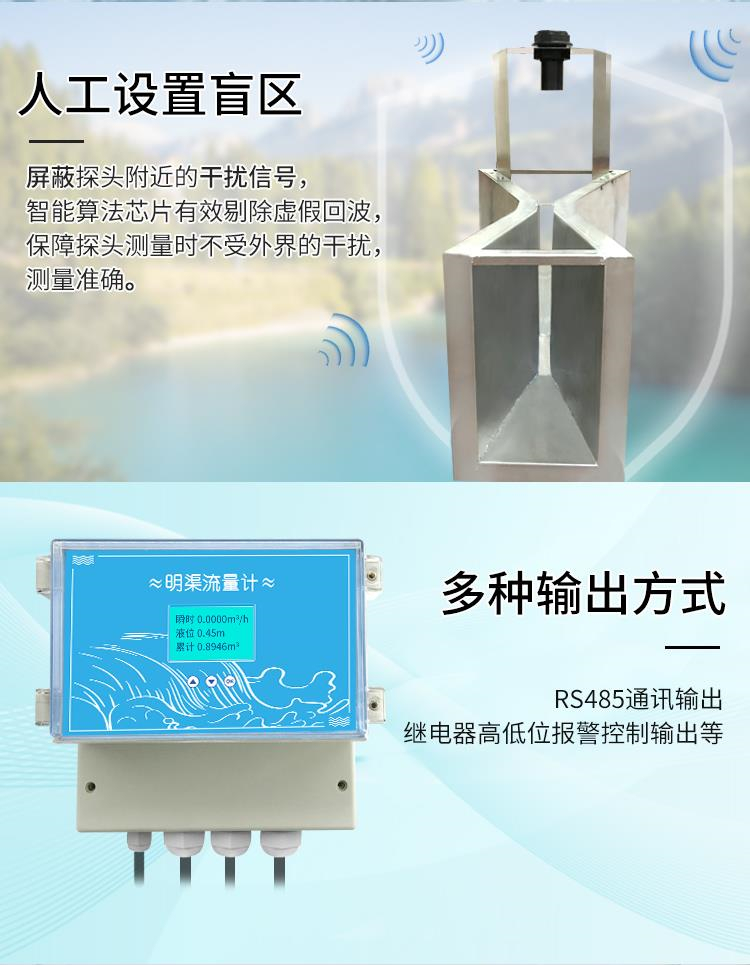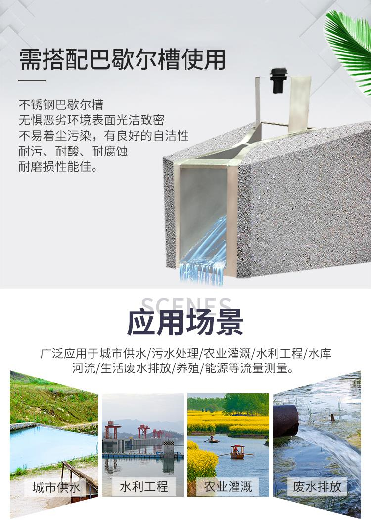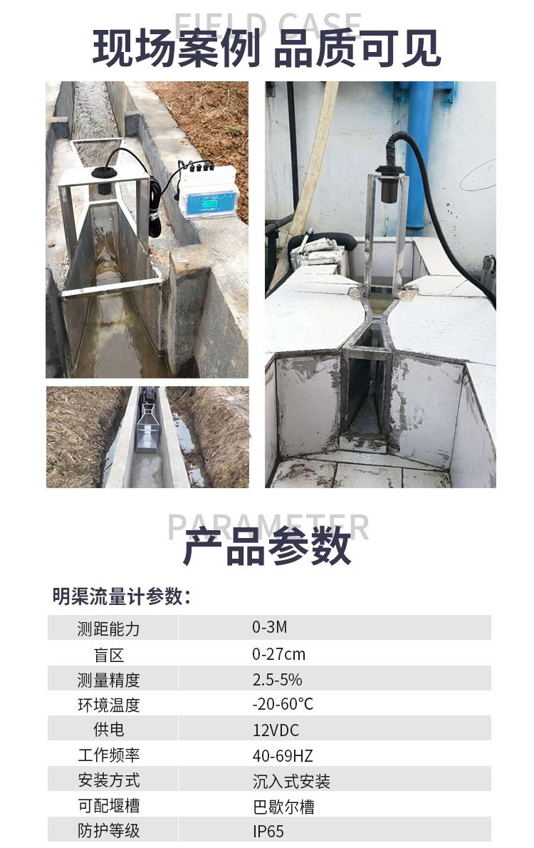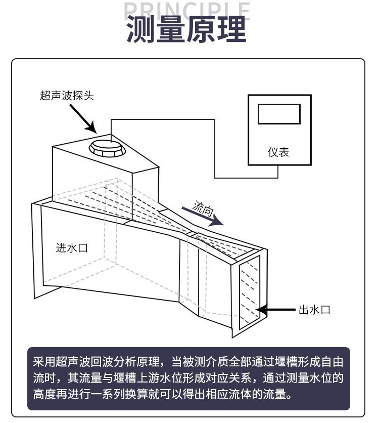 超聲波明渠流量計與量水堰槽配合使用,測量明渠內水的流量。常見明渠有三角堰、矩形堰、巴歇爾槽。主要用于測量污水廠、企事業單位的污水排放口、城市下水道的流量及灌渠等。由于采用非接觸的方法測量,因此在粘污、腐蝕性液體情況下,比其他形式的儀表具有更高的可靠性。
